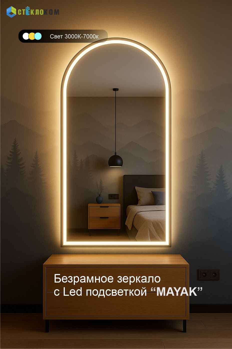 Арочное зеркало Mayak с лицевой LED-подсветкой — это элегантный акцент в интерьере, который подчеркнёт стиль и обеспечит комфортное освещение. Подходит для ванной, спальни, прихожей или коммерческих пространств.