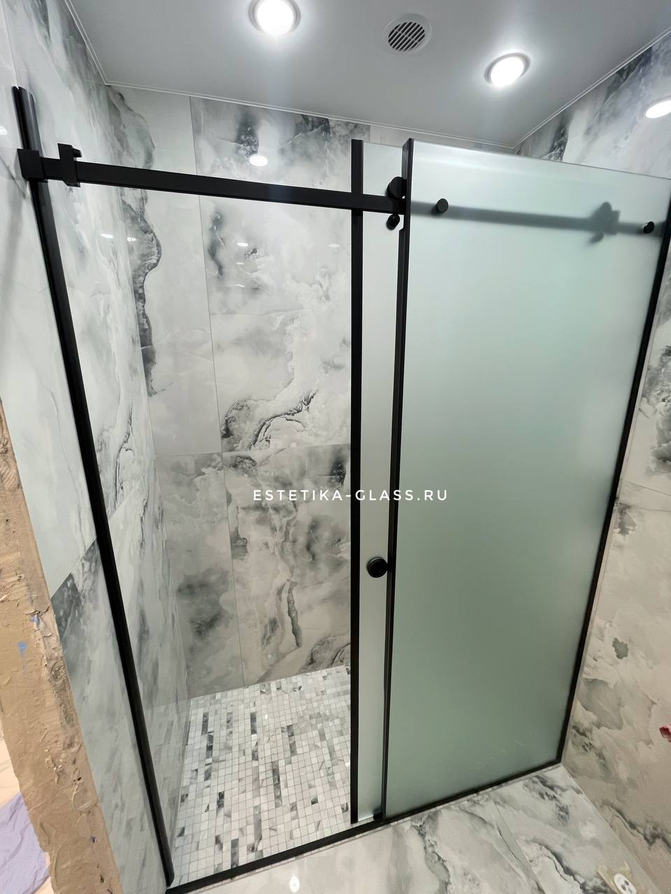 Бескаркасная раздвижная угловая дверь 110 х 90 см, фурнитура черная.