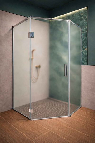 Модель 110×110 см обеспечивает максимальное удобство. Матовое стекло защищает от видимости капель, а трапециевидная форма гармонично вписывается в интерьер просторной ванной комнаты.