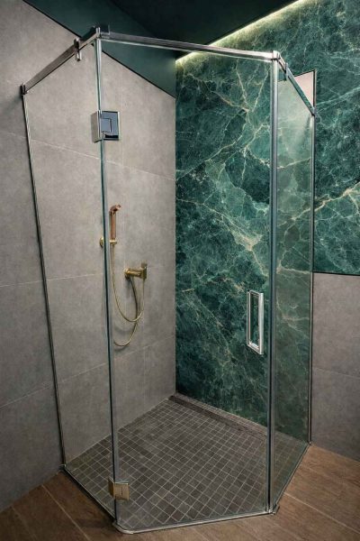 Стеклянная душевая трапеция 90×90 см без поддона предназначена для создания современной душевой зоны в уровень с полом. Конструкция обеспечивает удобный вход и визуально лёгкий интерьер ванной комнаты.
