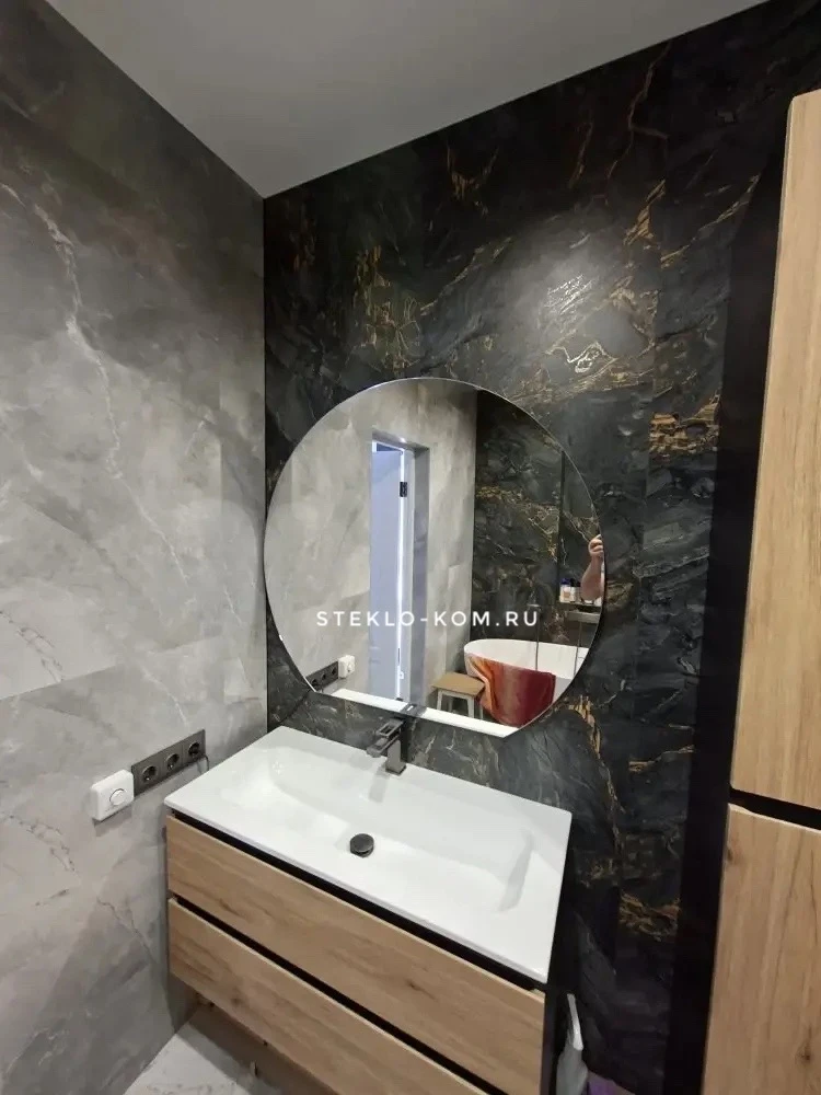 Такая форма отличается от классических круглых зеркал и относится к категории фигурных дизайнерских зеркал. Благодаря прямому основанию зеркало визуально выравнивается с мебелью и раковиной и смотрится более гармонично в интерьере ванной комнаты.