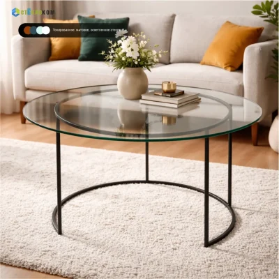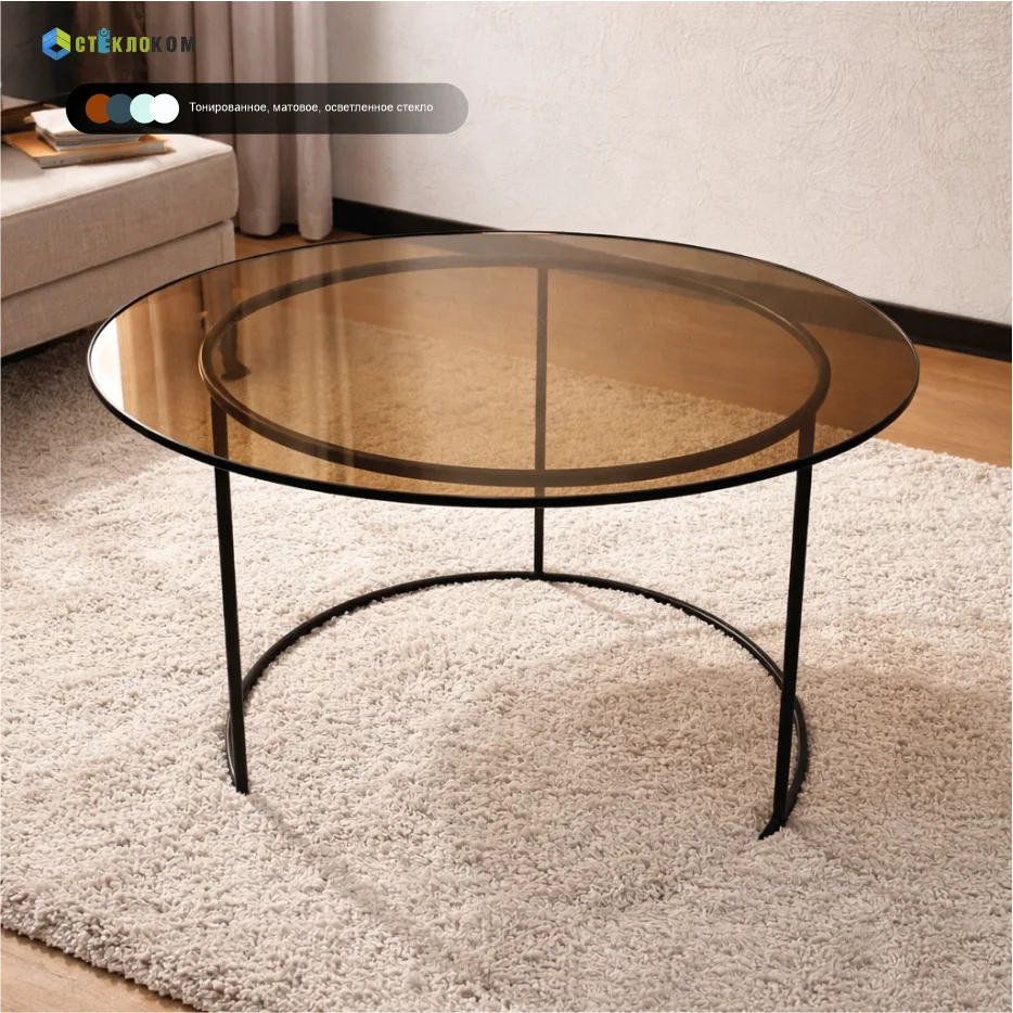 Круглая столешница из закаленного стекла толщиной 6 мм, без подстолья — прочная, безопасная, устойчива к царапинам, влаге и горячему. Изготовим на заказ любого диаметра — от 400 до 1200 мм. Цвет на выбор: бронза, сатин, графит, прозрачный или осветленное стекло. Просто оформите заказ — предоплата не требуется. Мы свяжемся, чтобы уточнить размер, цвет и обработку кромки.