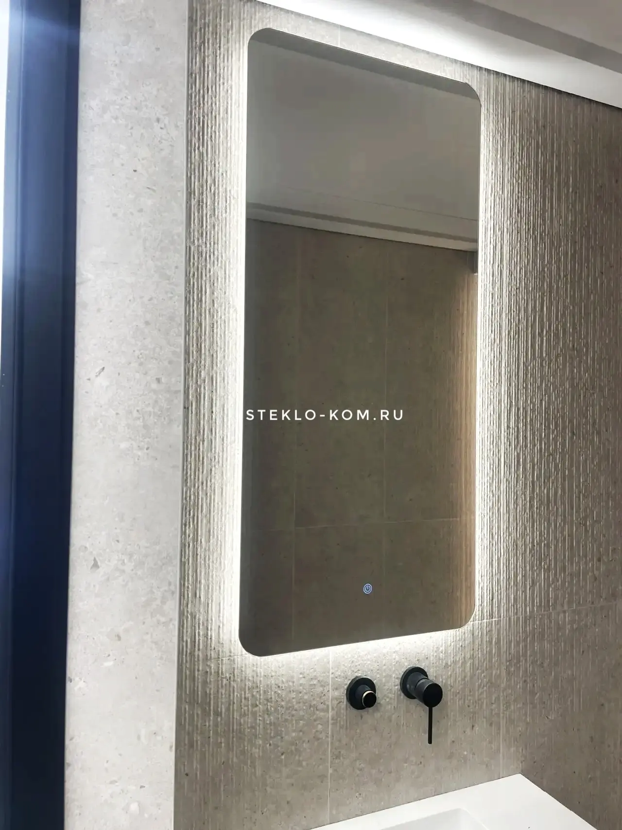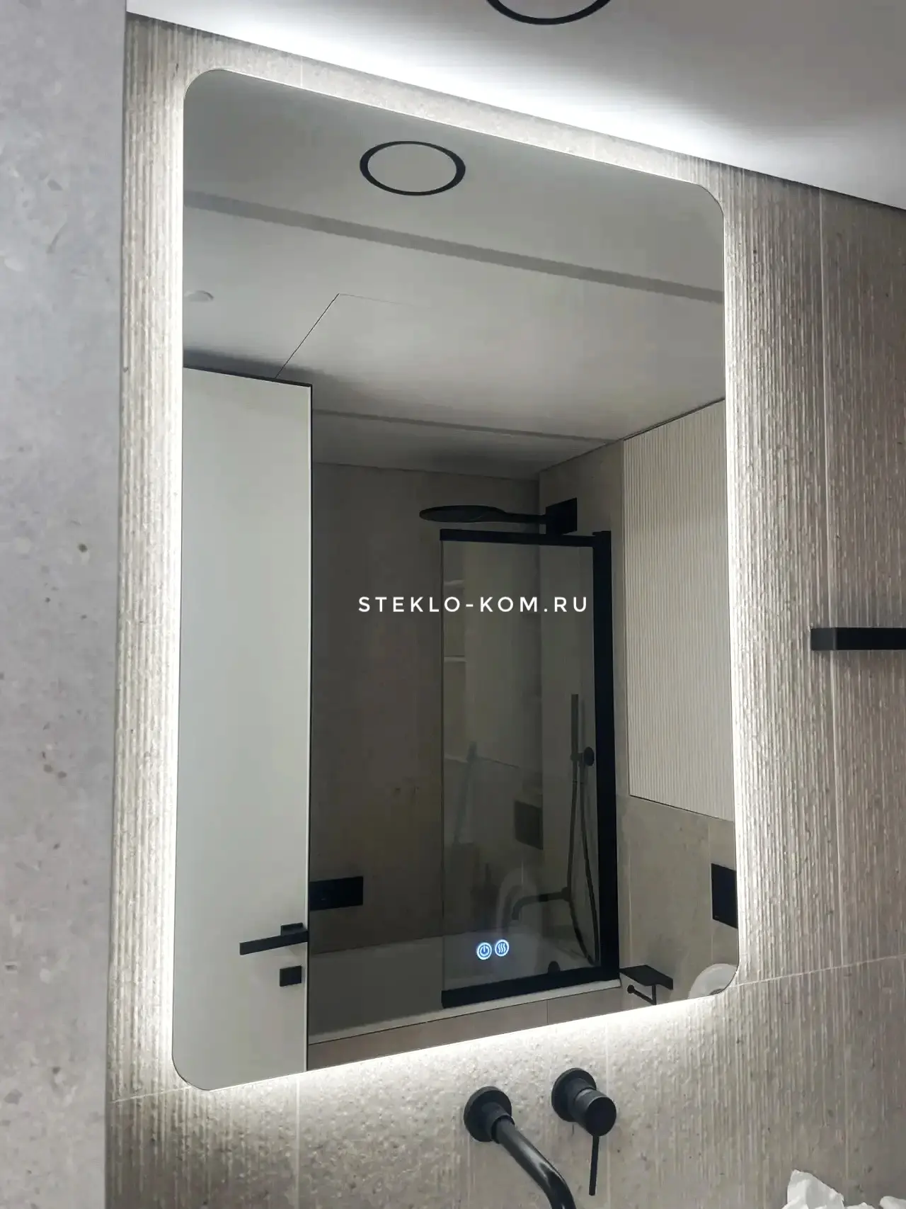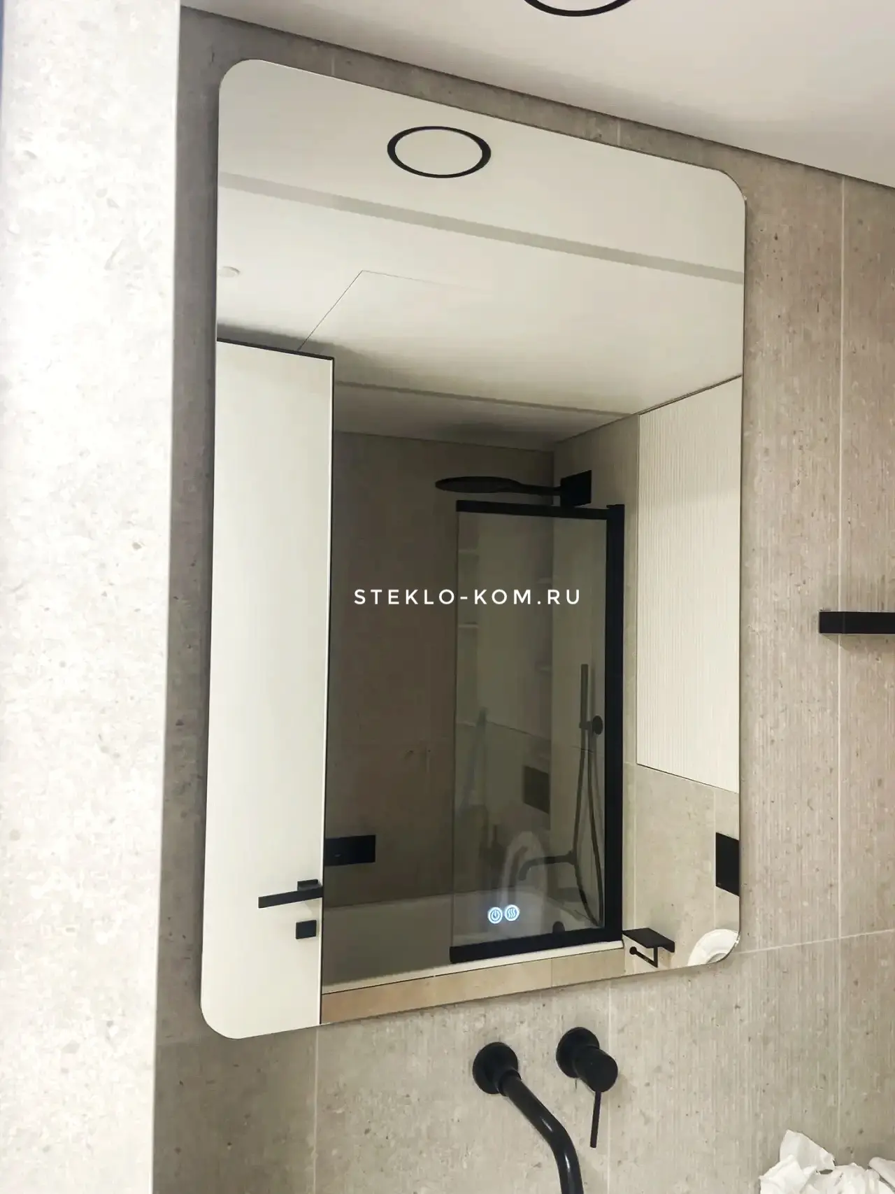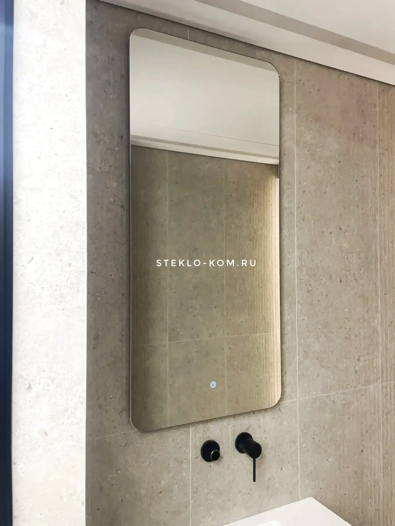 Форма зеркала выполнена со скругленными углами, что делает внешний вид более аккуратным и хорошо подходит для современных интерьеров ванной комнаты.