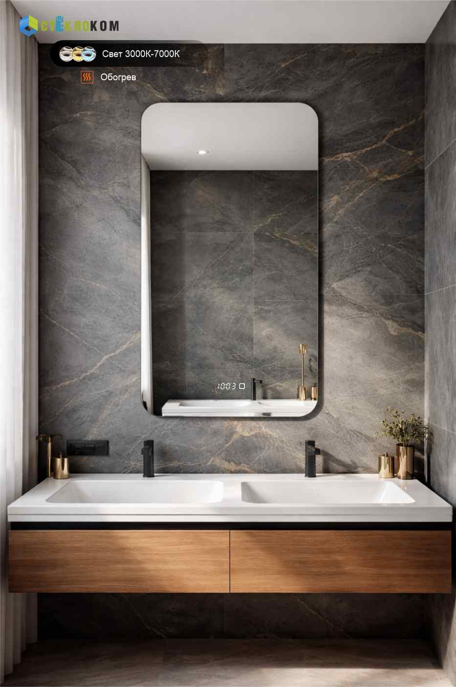 Парящее зеркало с LED подсветкой, подогревом, часами и скругленными углами