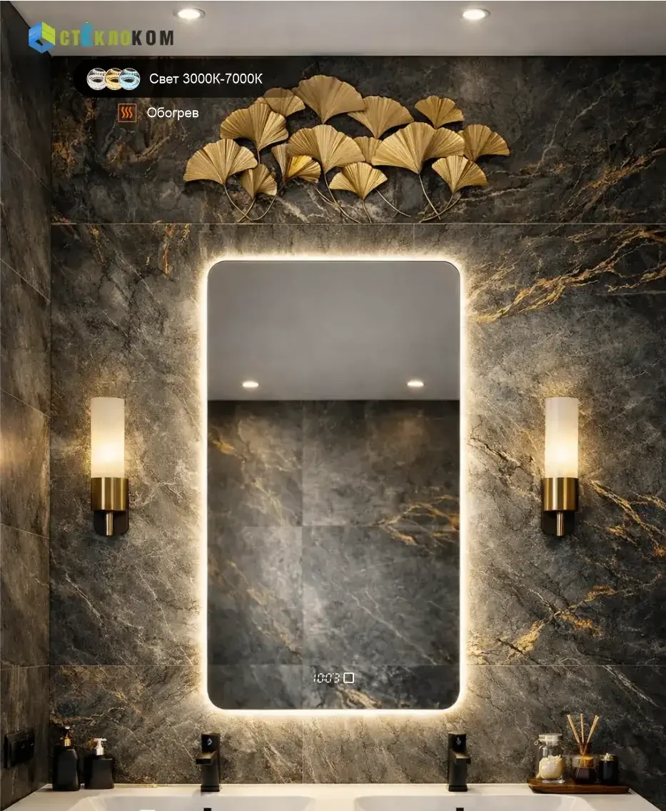 Парящее зеркало с LED подсветкой, скругленными углами и часами