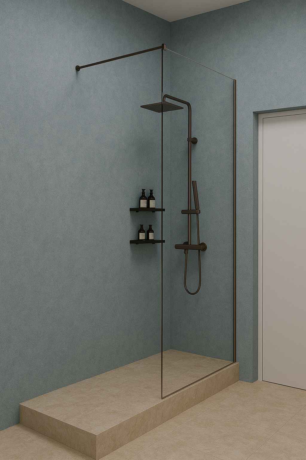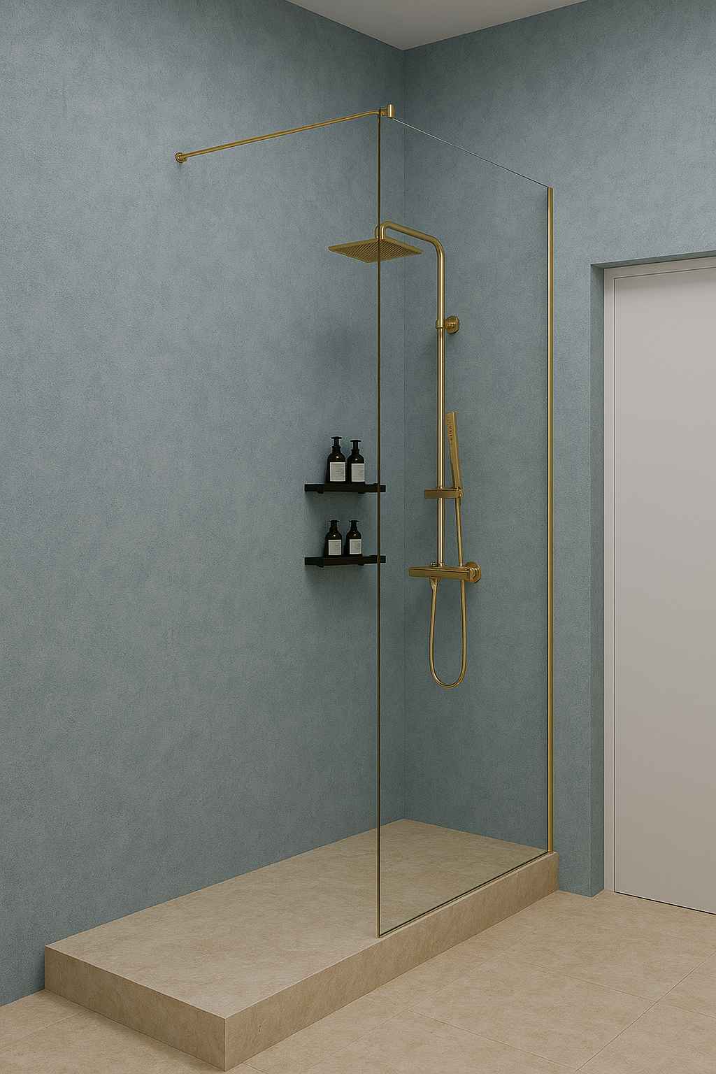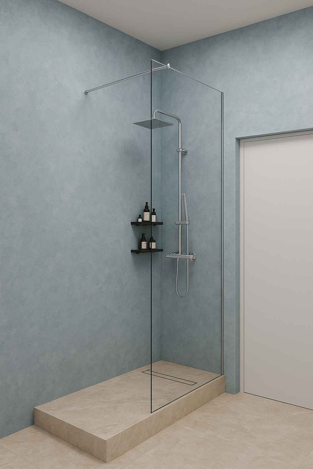 Стеклянная перегородка в душевую на поддон. Стационарное закаленное стекло для защиты от брызг и современного дизайна ванной, толщиной 8 мм. Надежное крепление, простота ухода. Доступна длина 200 см и другие размеры. Изготовление на заказ