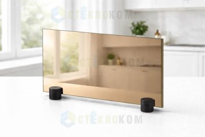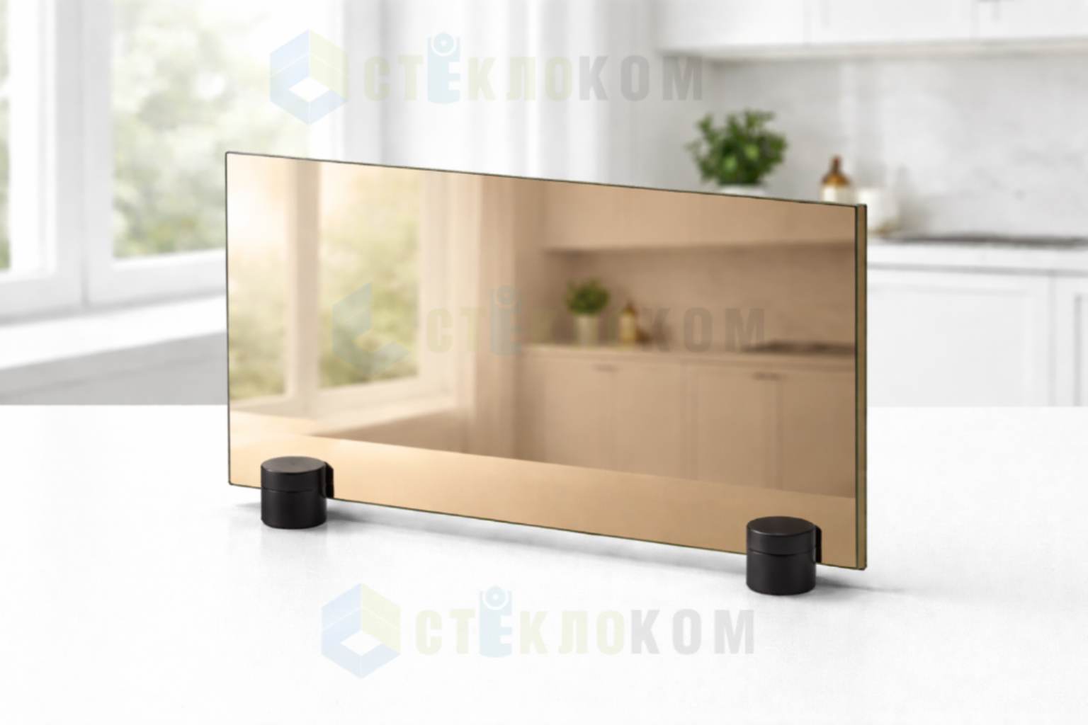 Безопасное зеркало 4 мм с бронзовым оттенком и мягким отражением. Используется травмобезопасная плёнка с обратной стороны. Цена указана за 1 м². Обработка и сверление считаются отдельно — для расчёта обратитесь к менеджерам.