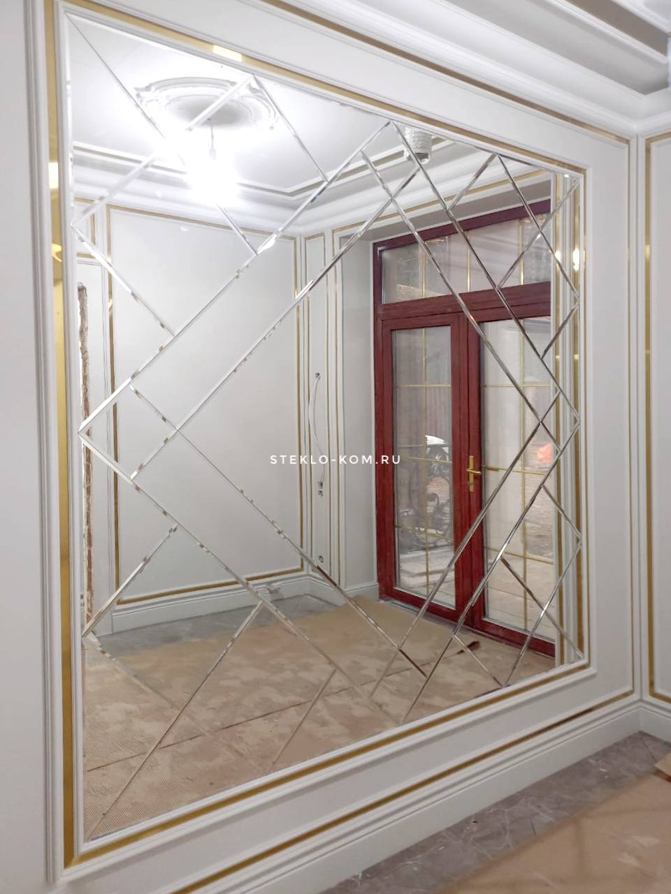 Изысканное зеркальное панно из осветлённого стекла толщиной 4 мм с фацетом 10 мм.