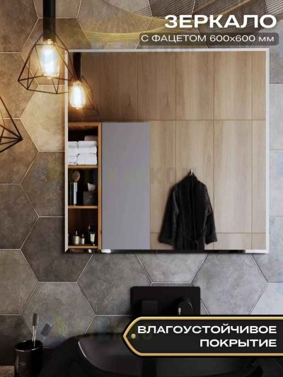 Настенное зеркало 60×60 см — практичное и недорогое решение для ванной комнаты, прихожей или спальни. Модель выполнена без рамы и подсветки, что делает дизайн универсальным и минималистичным. Фацетная кромка придаёт зеркалу аккуратный и завершённый внешний вид.