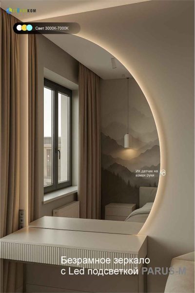 Современное полукруглое зеркало Parus-M с LED-подсветкой — это сочетание дизайна и функциональности. Изготавливаем зеркала любых нестандартных размеров под заказ всего за 10 рабочих дней. Подходит для спальни, гостиной, прихожей или ванной.