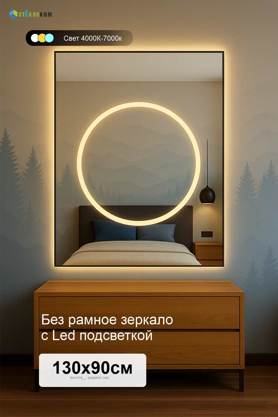 Современное прямоугольное зеркало 1300×900 мм с лицевой круговой подсветкой 35 мм. Подходит для спальни, ванной и прихожей. Идеальное решение для стильного интерьера. Доступно в стандартных и индивидуальных размерах под заказ.